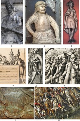 У чому ж була відмінність гусарського обладунку 1630–1651 рр. від обладунків останньої чверті XVII ст.? Згідно з зображальними джерелами, у час, що нас цікавить, носили сегментні кіраси типу «аніма» або приталені кіраси, в яких іноді нижня частина рельєфно імітувала горизонтальні нижні пластини. Також використовували комплекти, подібні до європейського обладунку «в три чверті». Особливість цього періоду – відсутність на кірасах мультанських хрестів, медальйонів з Дівою Марією, гербових чи інших композицій, у багатьох випадках спостерігається відсутність захисту плечей («рамен»). Сама кіраса, судячи з іконографії періоду, в більшості випадків була цільною, не мала окремих рухливих пластин по низу, а форма наплічників (у тих випадках, коли вони взагалі були), була іншою, ніж ті, які усі звикли бачити на романтизованих образах. На ряді зображень присутній захист верхньої частини стегна – тассети. У якості прикладів можна навести зображення фігурки з оздоби труни гетьмана Станіслава Жолкевського (р.ж. 1547–1620) з костелу св. Лаврентія у м. Жовква (Мал. 3, в) (Żygulski 43), фрагмент мапи Гійома Левассера де Боплана 1650 р. («Delineatio specialis et accurata Ukrainae») (Мал. 3, г), фрагменти гравюри «Alegoria Polski» 1645 р. («Alegoria Polski. Inc.») (Мал. 3, д, е) та фрагмент надгробку гетьмана Станіслава Жолкевського з костелу св. Лаврентія у м. Жовква з зображенням кіраси (Мал. 3, є).