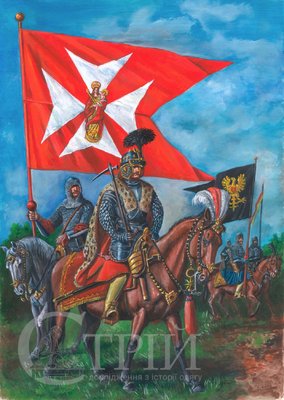Мал. 5. Художня реконструкція поручника червоної гусарської хоругви Яна Барановського та вершників панцерних хоругв (© С. Шаменков).