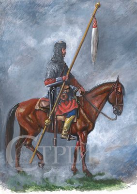 Більш детальна реконструкція панцерного надвірної хоругви князя Яреми Вишневецького зображена на наступному малюнку (Мал. 6). Вершника показано у повному спорядженні з князівським бунчуком у правиці. Він озброєний шаблею та бандольєтом на перев’язку. Цікаво відмітити підвішений до сідла «стакан» на шкіряному ремені, в якому фіксувався кінець древка бунчука.