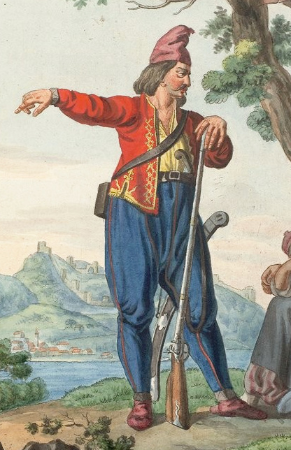 2. За часів існування попереднього, Одеського грецького дивізіону, у 1790-х рр., ми не виявили згадок про їхній однострій, і припускаємо, що у цей час греки та арнаути проходили службу в звичайному для себе одязі, у якому вони займалися піратством у Егейському морі (Мал. 1) («Illustrations de Les peuples»).